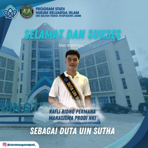HKI UIN JAMBI – Rafly Ridho Permana, Mahasiswa Program Studi Hukum Keluarga Islam, Fakultas Syariah Universitas Islam Negeri Sulthan Thaha Saifuddin Jambi terpilih sebagai Duta UIN SUTHA Jambi Tahun 2023 (10/07/2023). Dalam Rangka Persiapan PKM Ke-III PTKIN Se-Sumatera dan PTI Se- Asia Tenggara Tahun 2023 Duta UIN SUTHA